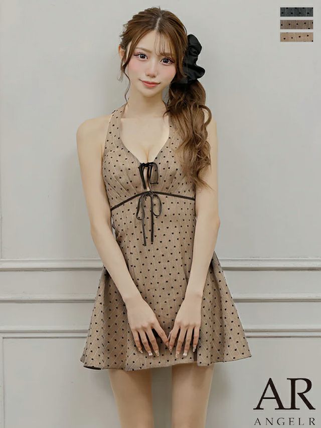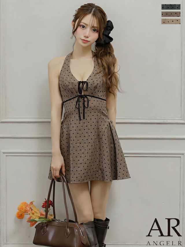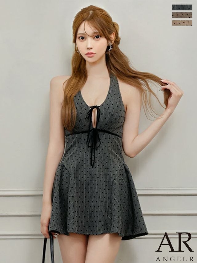 デコルテ魅せで美しくキュートに♡ [Angel-R/エンジェルアール] 高級 ネックリボン ホルターネック ドット柄 リボン Vカット ベロア フレアミニドレス