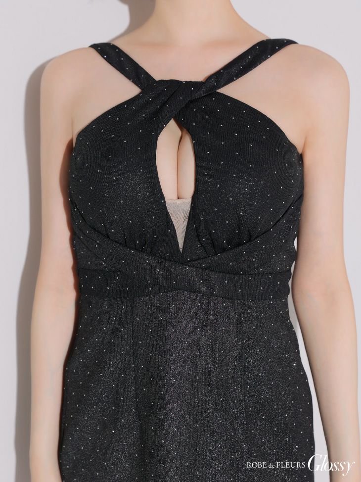 4. [ROBEdeFLEURSGlossy/ローブドフルールグロッシー] 高級 クロスデザイン ホルターネック ストーン ドット柄 ラメニット バストカット タイトミニドレス