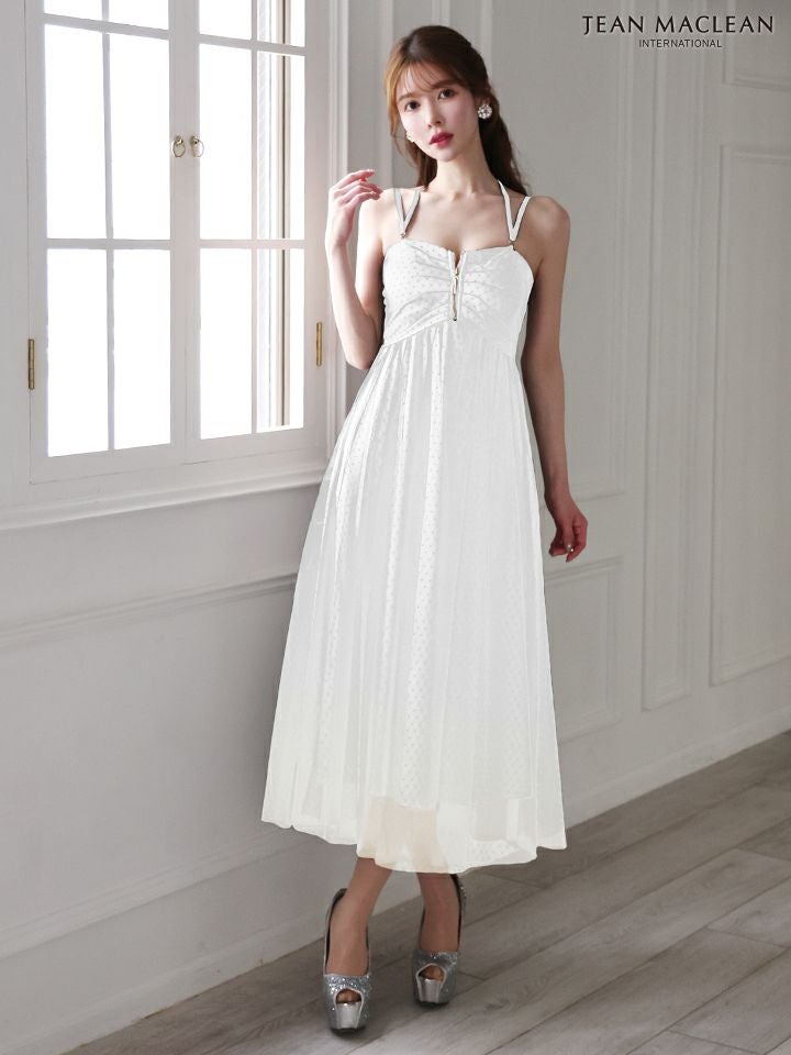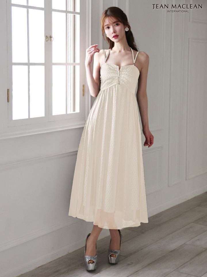 谷間のチラ魅せで魅了する☆ [JEANMACLEAN/ジャンマクレーン] 高級 ドット柄 チュール キャミソール ジップ ネックリボン シンプル Aラインロングドレス