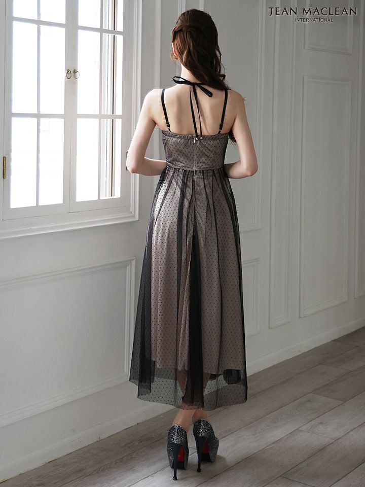 5. [JEANMACLEAN/ジャンマクレーン] 高級 ドット柄 チュール キャミソール ジップ ネックリボン シンプル Aラインロングドレス