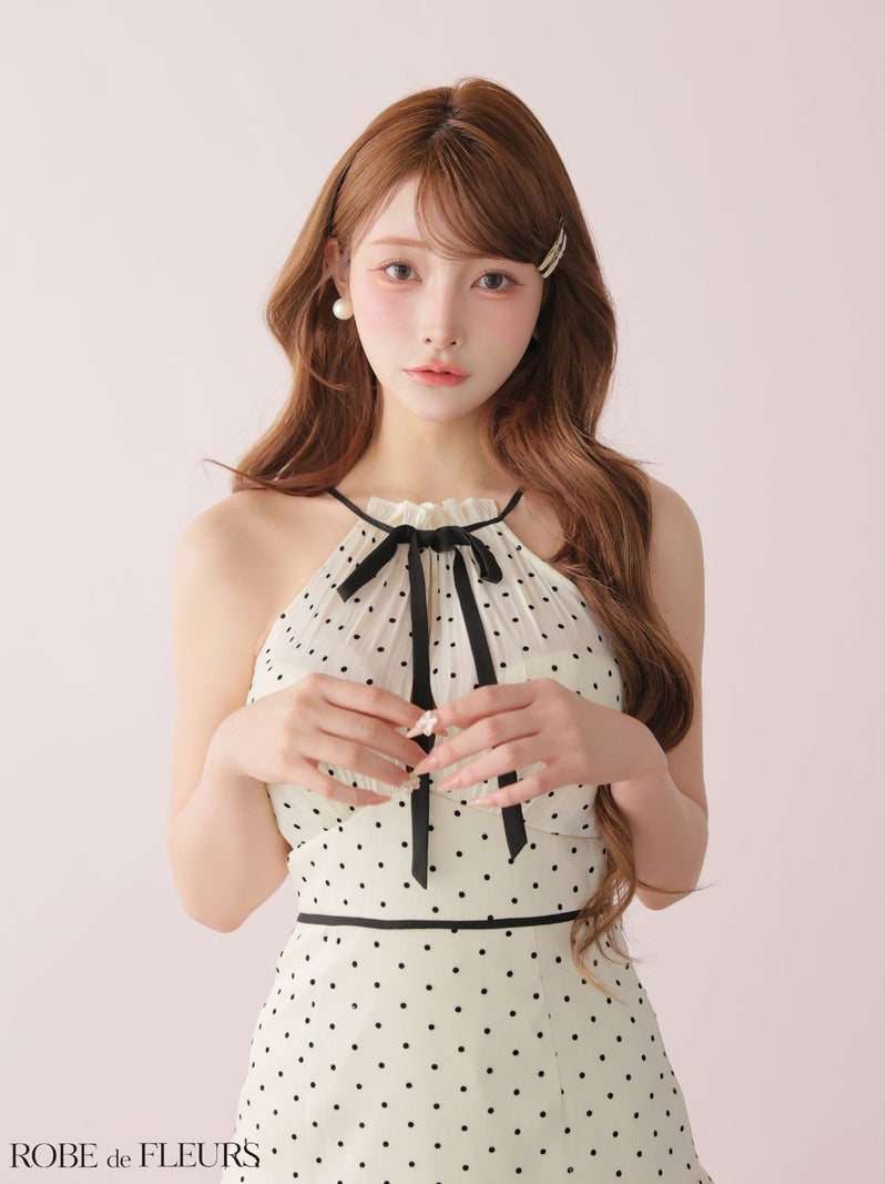 クラシカルな可愛さで差をつける♡ [ROBEdeFLEURS/ローブドフルール] 高級 ブランド Aラインミニドレス 谷間 ホルターネック ドット柄 背中魅せ ネックリボン 裾フリル