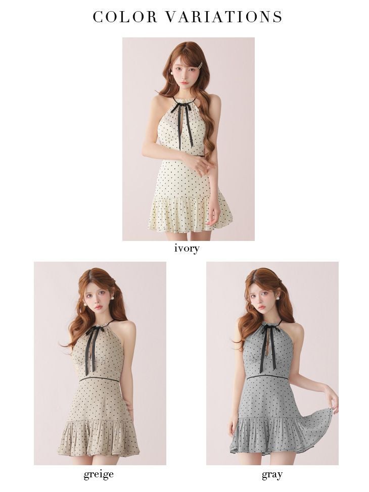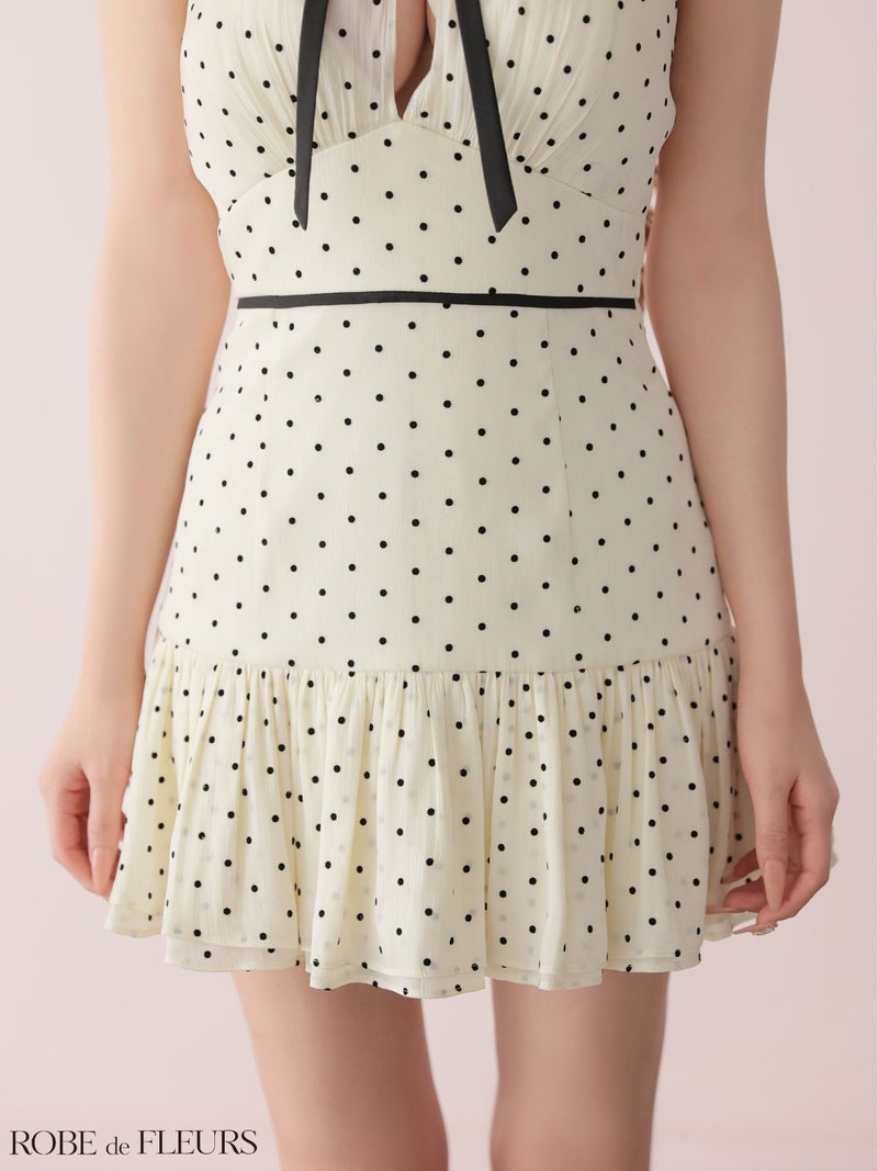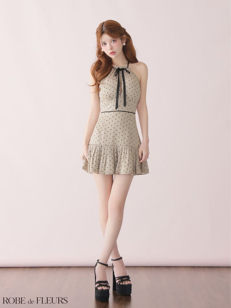 4. [ROBEdeFLEURS/ローブドフルール] 高級 ブランド Aラインミニドレス 谷間 ホルターネック ドット柄 背中魅せ ネックリボン 裾フリル