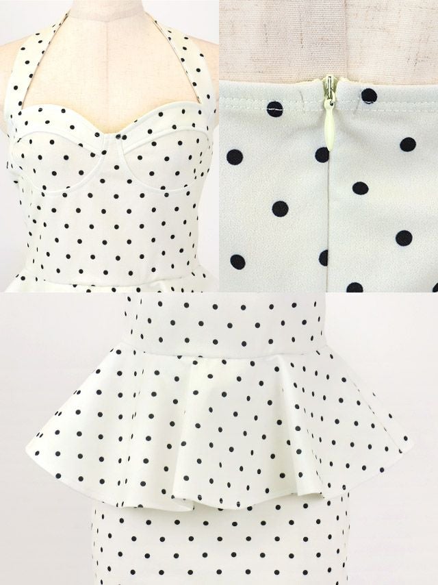 ホルターネック ワンカラー ドット柄 バストハートカット 背中魅せ ペプラム タイトミニドレスのメイン画像