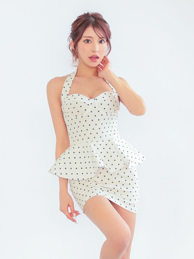 ホルターネック ワンカラー ドット柄 バストハートカット 背中魅せ ペプラム タイトミニドレスのイメージ画像1