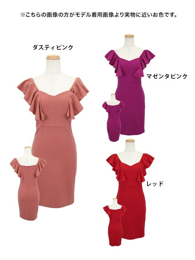 女の子らしいフリルが可愛い♪ [SUPER SALE] 安い タイトミニドレス ホステス オフショルダー 大きいサイズ シンプル 大人 ノースリーブ ストレッチ ブラジャーのまま 2way (林姫奈妙着用)