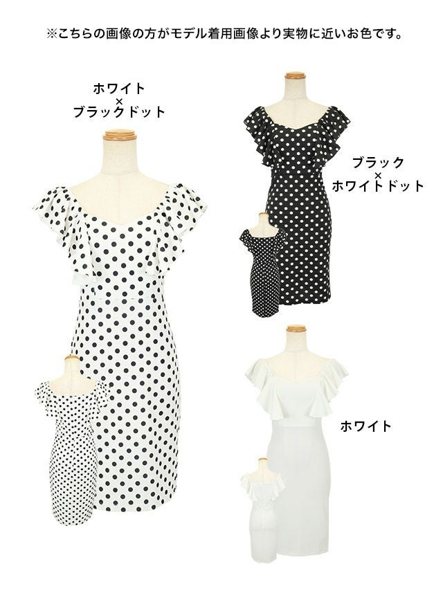 ドット柄ペンタゴンネックフリル袖タイト膝丈ドレスのイメージ画像1