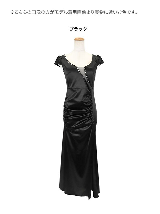 安い タイトロングドレス 谷間 大人 スリット 上品 半袖 ワンカラー パール