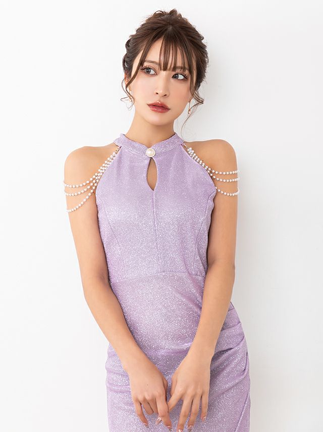 ギャザー入りホルターネックバストカットパールアクセサリー付きタイトミニドレスのカラバリ画像