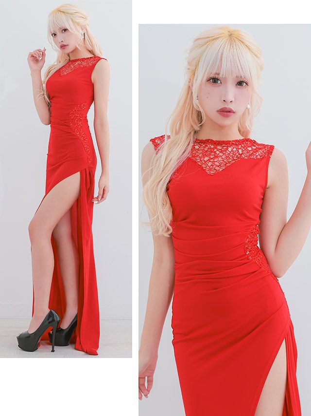 4. [ゲリラセール] 安い タイトロングドレス シンプル レース 大人 スリット ノースリーブ ストレッチ (向葵まる着用)