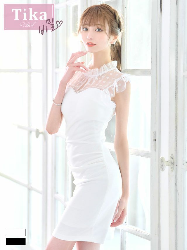 キャバドレス ミニ丈 韓国 ワンピース 大きいサイズ Tika ティカ シースルードット柄ハイネックフリル袖レディスタイルタイトミニドレス