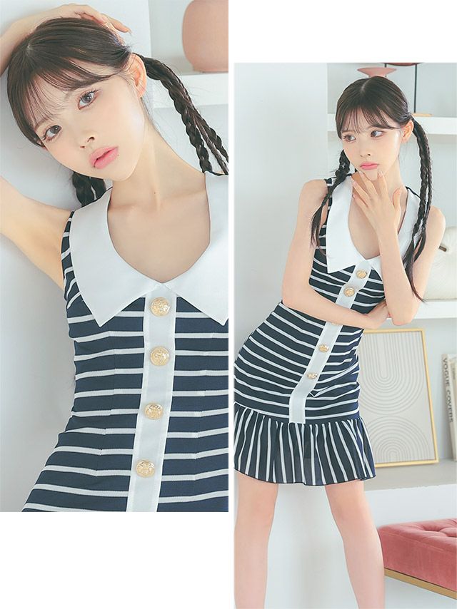 3. [SALE] [韓国ドレス] 襟付き ボーダー ノースリーブ フリル フレアミニドレス (Sサイズ~Lサイズ) (緩苺/キャバドレス着用) [TikaPimil]