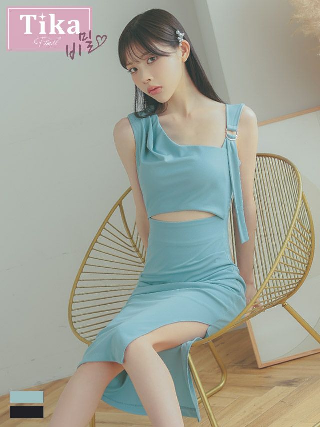 5. [韓国ドレス] ワンショルダー風アシメサッシュショルダーウエストカットアウトワンカラーサイド膝丈ドレス (Sサイズ~Lサイズ) (緩苺/キャバドレス着用) [TikaPimil]