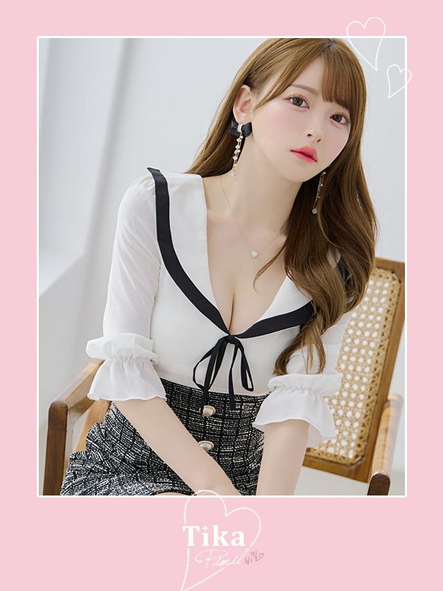3. [韓国ドレス] 襟付き ネックリボン シフォン パフスリーブ ツイード チェック柄 袖あり 五分袖 フレアミニドレス (Sサイズ~Lサイズ) (黒崎みさ/キャバドレス着用) [TikaPimil]