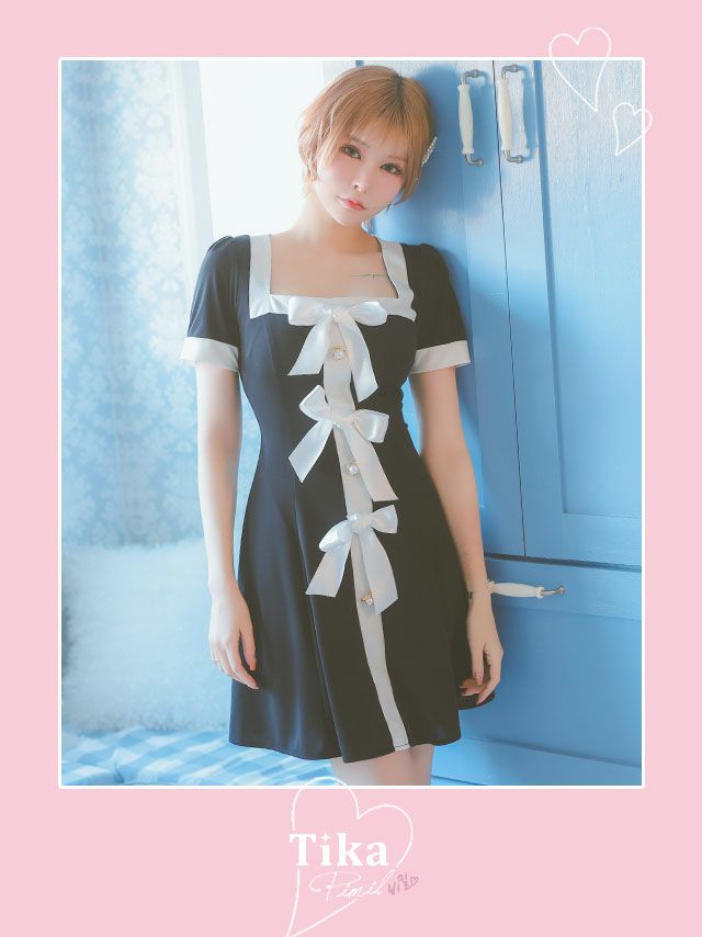 5. [SALE] [韓国ドレス] パイピングフロントリボンパールデザイン半袖モノトーンフレアミニドレス (Sサイズ~Lサイズ) (戦慄かなの/キャバドレス着用) [TikaPimil]