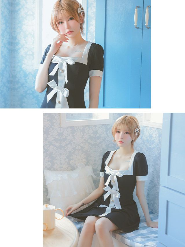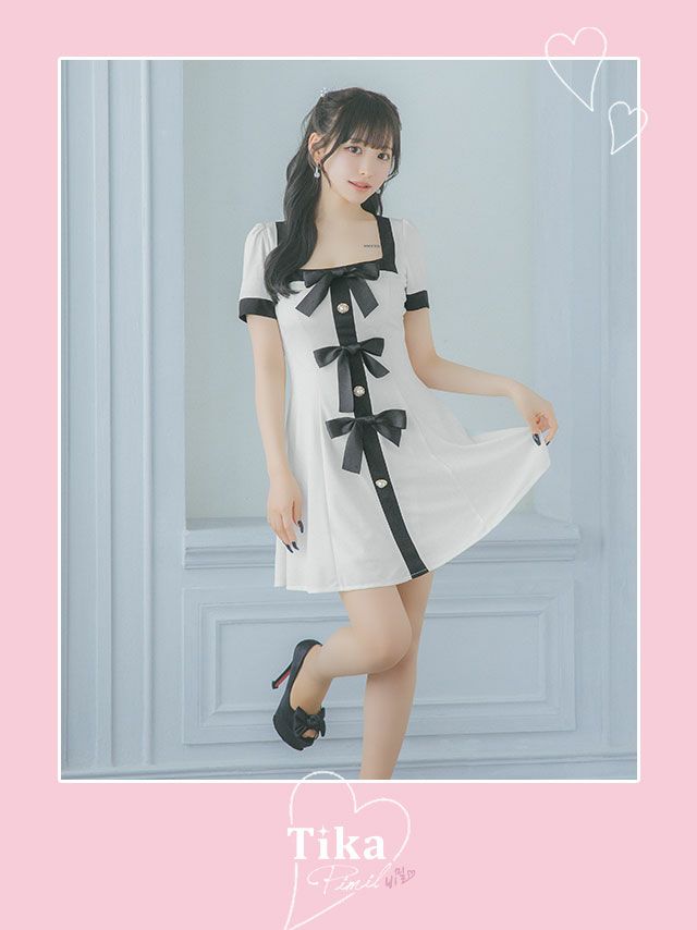 推し活にもおすすめ♪ [SALE] [韓国ドレス] パイピングフロントリボンパールデザイン半袖モノトーンフレアミニドレス (Sサイズ~Lサイズ) (戦慄かなの/キャバドレス着用) [TikaPimil]