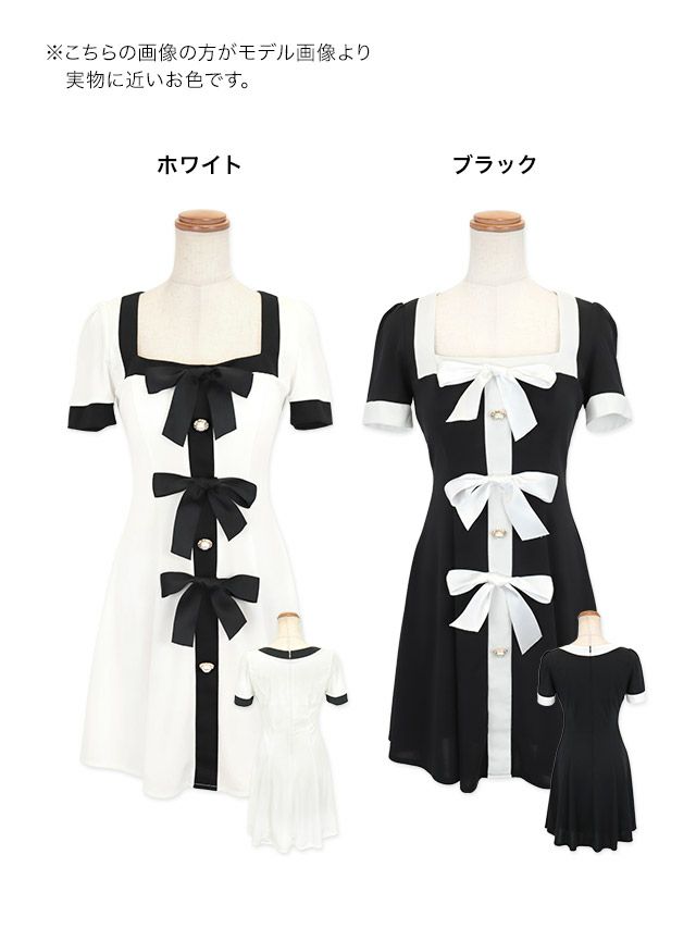 パイピングフロントリボンパールデザイン半袖モノトーンフレアミニドレスのカラーバリエーション