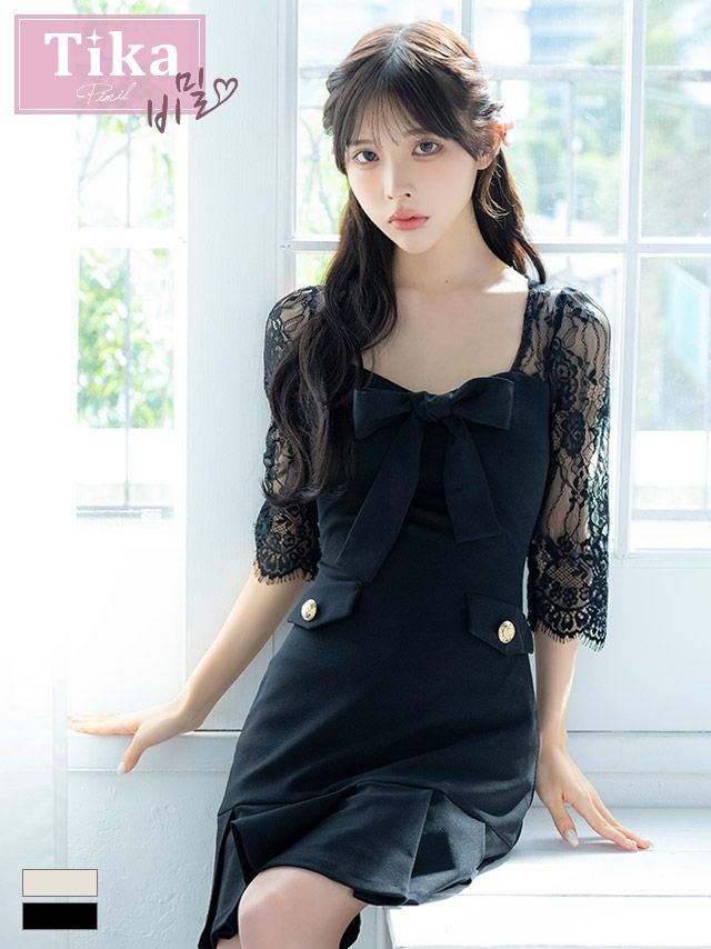 [韓国ドレス] 袖あり 五分袖 レース切り替え バストリボン ボックスプリーツ タイトミニドレス (Sサイズ~Lサイズ) (黒崎みさ/キャバドレス着用) [TikaPimil]