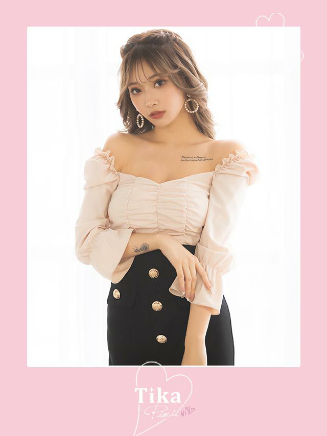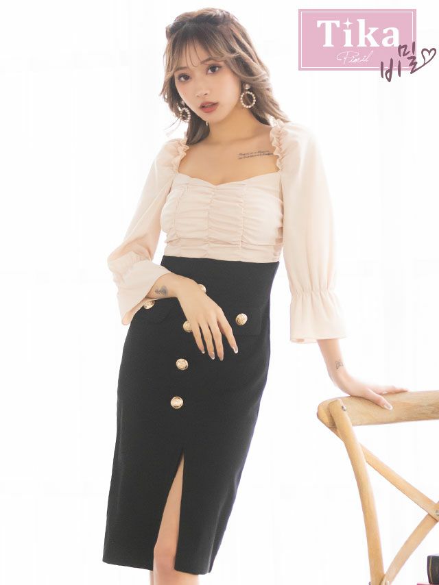 [SALE] [韓国ドレス] ハイウエスト切替フリル袖あり膝丈タイトドレス (Sサイズ~Lサイズ) (PyunA./キャバドレス着用) [TikaPimil]