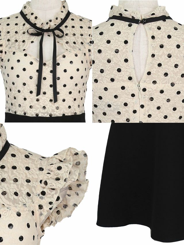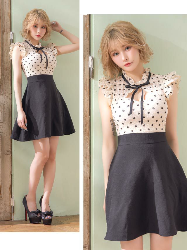 [韓国ドレス] ドット柄フリル袖ネックリボンフレアミニドレス (Sサイズ~Lサイズ) (戦慄かなの/キャバドレス着用) [TikaPimil]