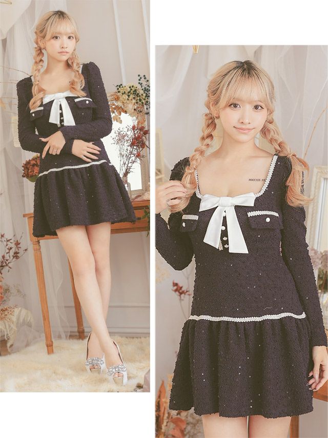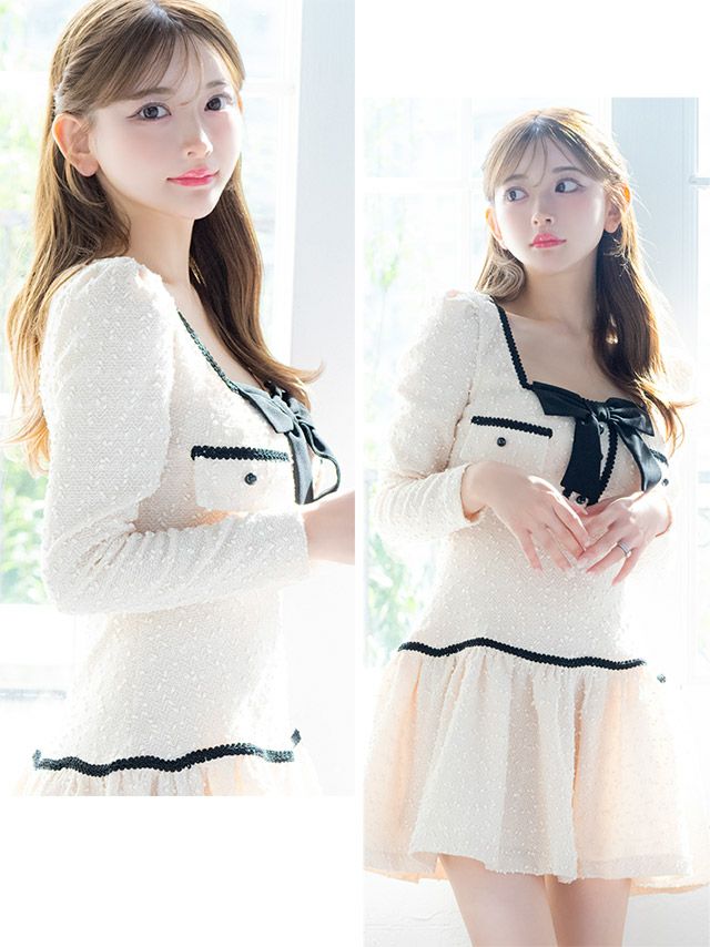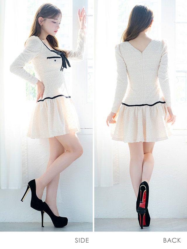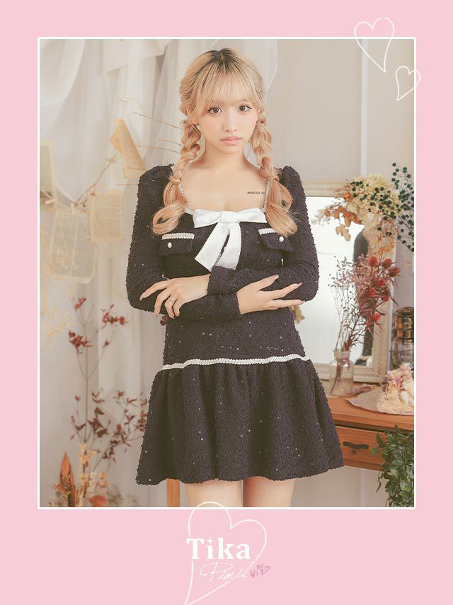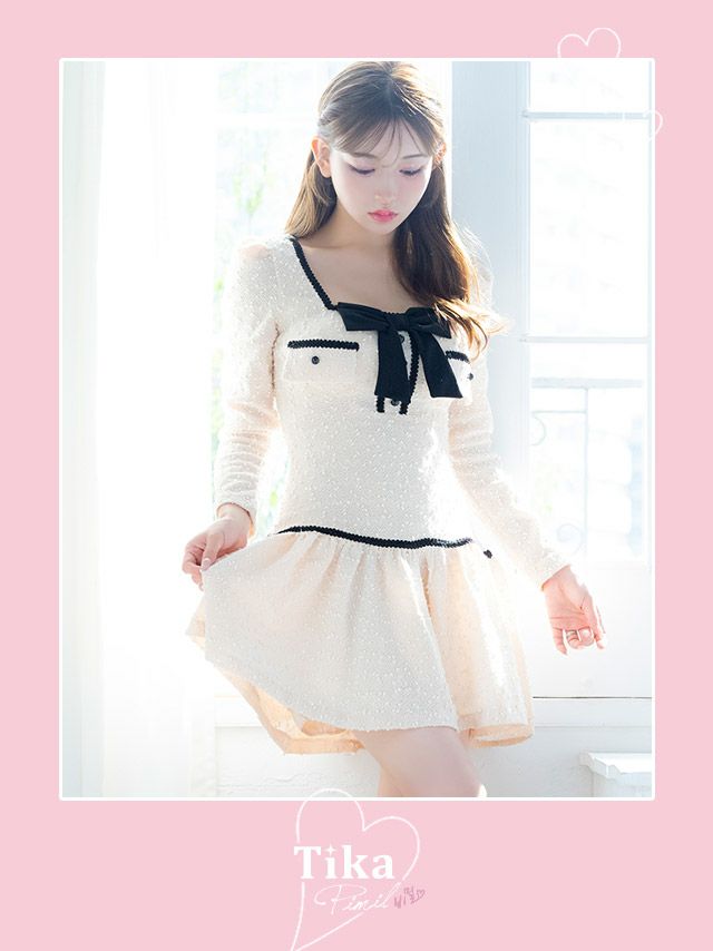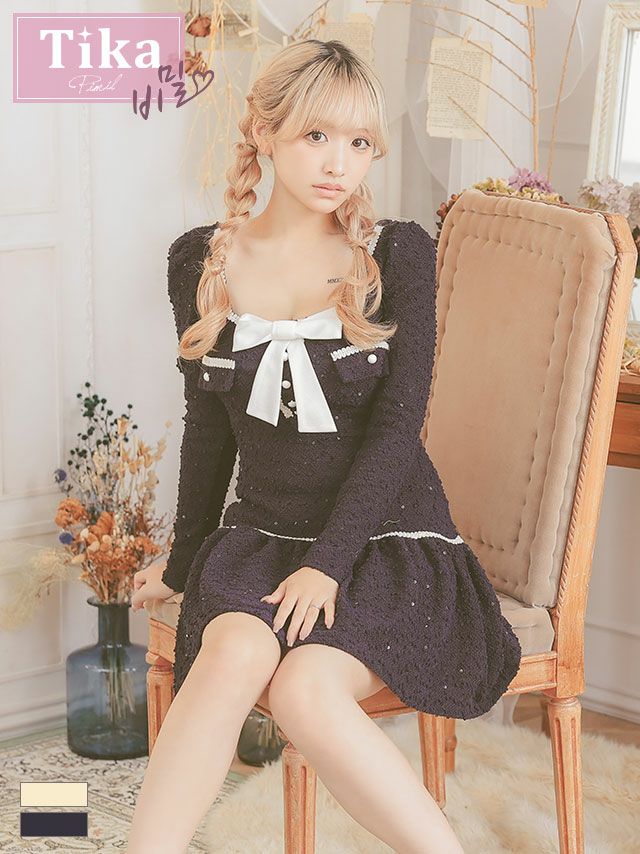 キャバドレス 韓国 ミニ丈 大きいサイズ 袖あり Tika ティカ 長袖パイピングネックリボンニットフリルフレアミニドレス