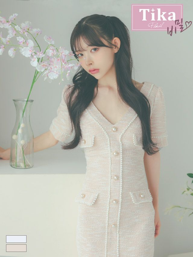 3. [韓国ドレス] ストレッチニット Vネック パールボタン 半袖 タイトミニドレス (Sサイズ~Lサイズ) (緩苺/キャバドレス着用) [TikaPimil]