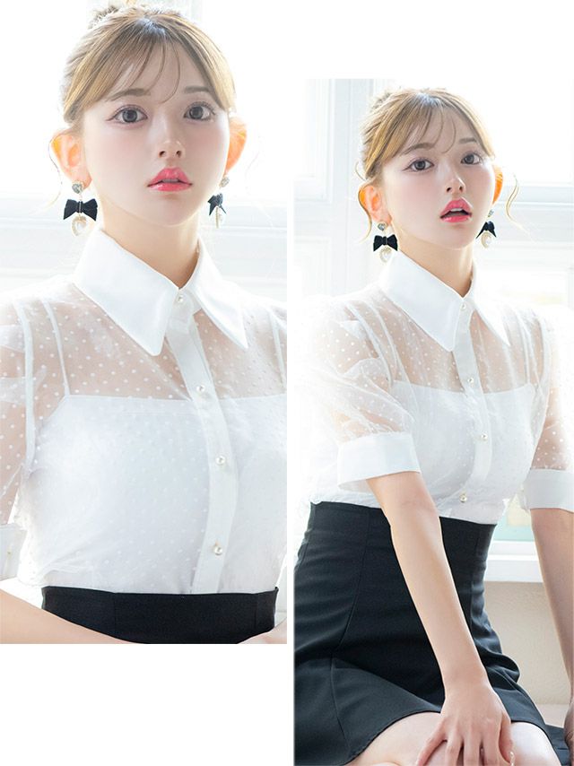 3. [韓国ドレス] 襟付き 半袖 ドット柄 シアーシャツセットアップ フレアミニドレス (Sサイズ/Mサイズ) (緩苺/キャバドレス着用) [TikaPimil]