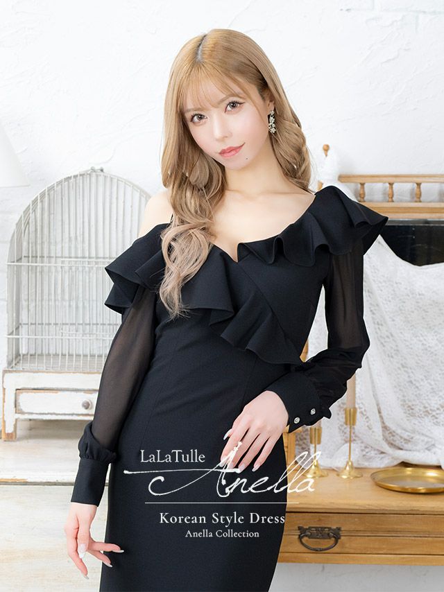 1/22再入荷★気品溢れる1着☆ [韓国ドレス] タイト膝丈ドレス 袖あり 長袖 フリルワンショルダー シースルー (Sサイズ~Lサイズ) (一条響着用) [Anella]