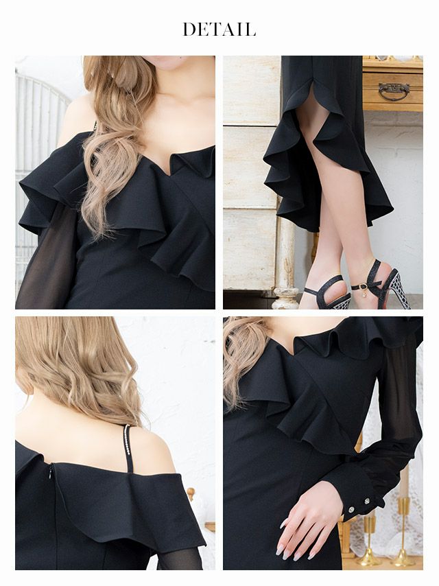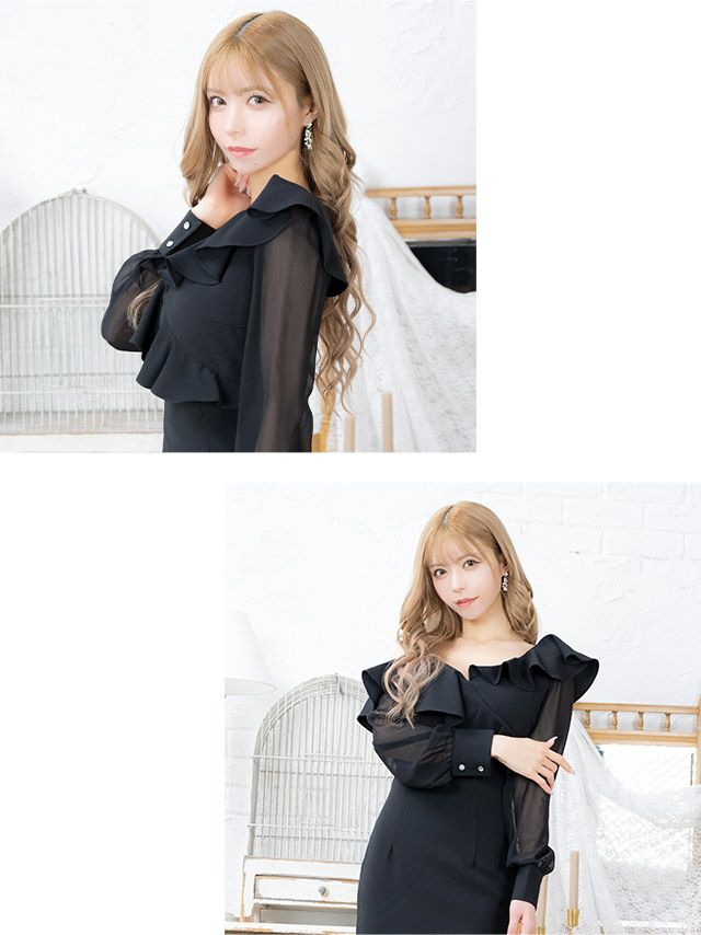4. [韓国ドレス] タイト膝丈ドレス 袖あり 長袖 フリルワンショルダー シースルー (Sサイズ~Lサイズ) (一条響着用) [Anella]
