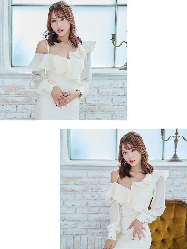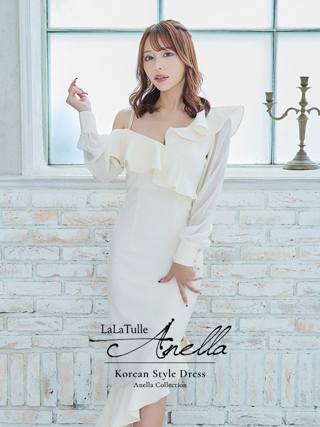 キャバドレス Anella アネラ ワンショルダー 胸元フリル シースルー 長袖 タイト 膝丈韓国ドレス