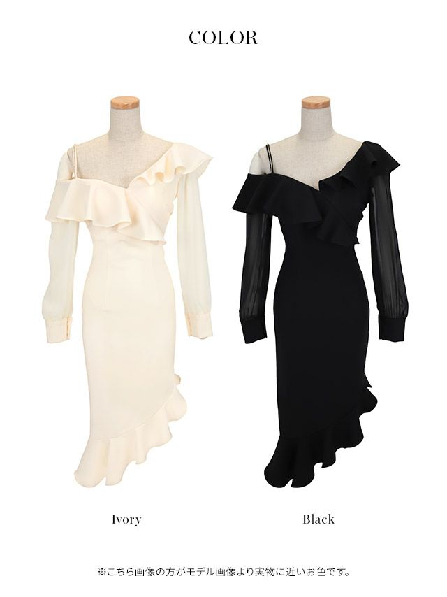 3. [韓国ドレス] タイト膝丈ドレス 袖あり 長袖 フリルワンショルダー シースルー (Sサイズ~Lサイズ) (一条響着用) [Anella]