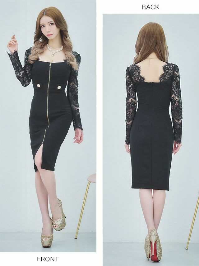 Anella アネラ レーススリーブフロントジップデザイン長袖膝丈タイト韓国ドレス (Sサイズ~Lサイズ) (一条響 キャバ韓国ドレス着用)