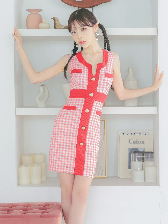 ポップで明るい印象に♪ [SALE] [韓国ドレス] ノースリーブギンガムチェック柄タイトミニドレス (Sサイズ~Lサイズ) (緩苺/キャバドレス着用) [TikaPimil]