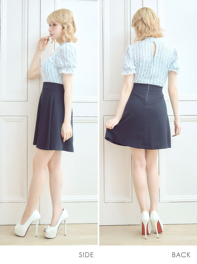 キャバドレス ミニ丈 韓国ドレス ワンピース Tika ティカ 半袖ふわふわレースネックリボンハイウエスト切替フレアガーリースタイルミニドレス