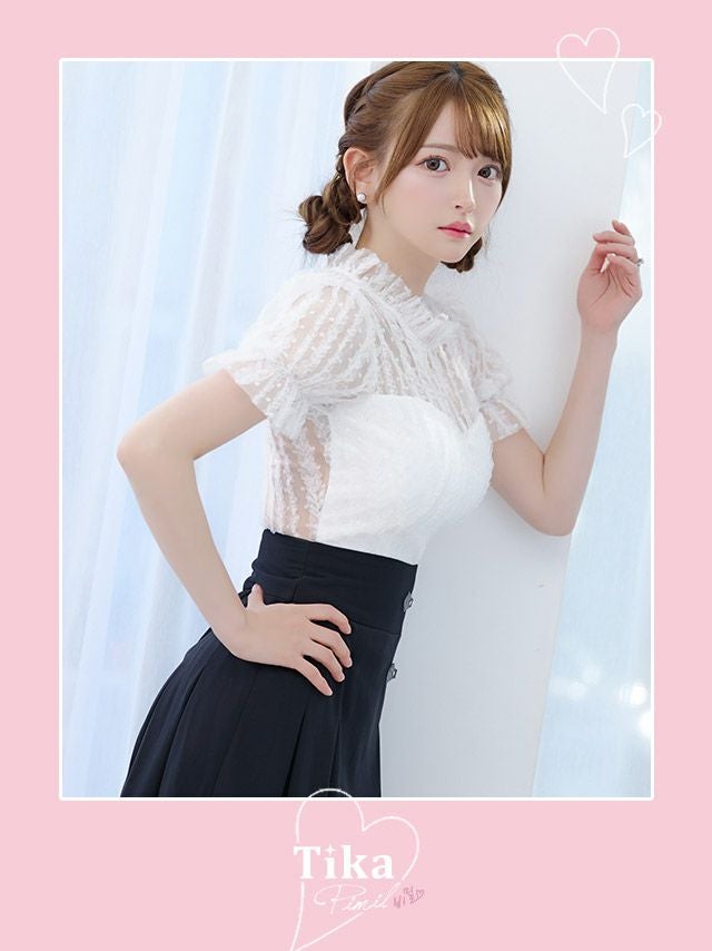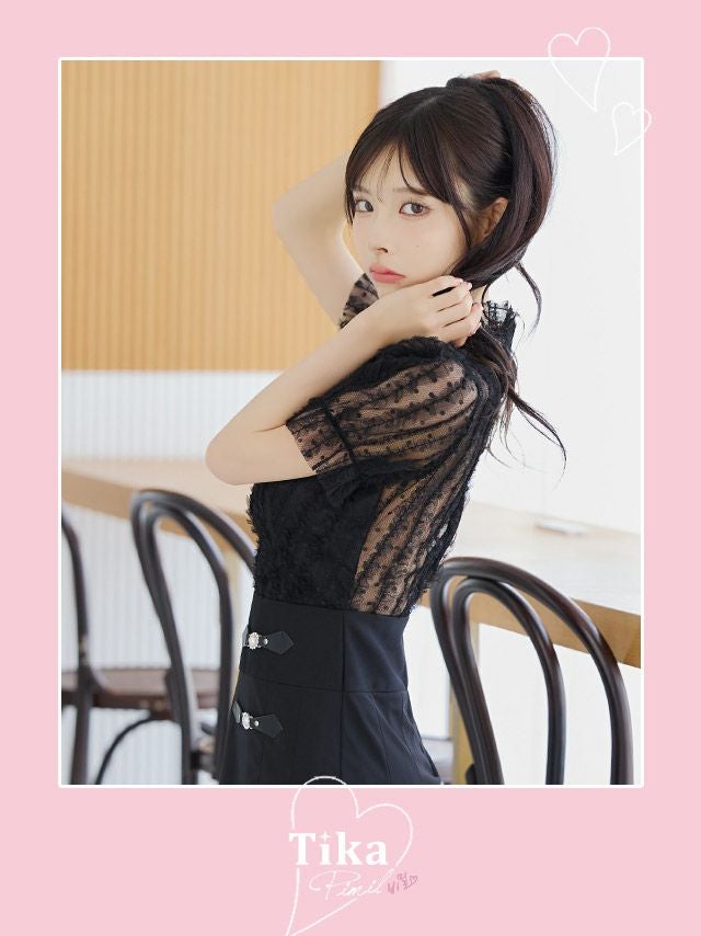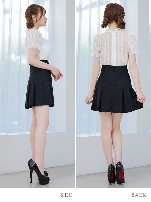 4. [韓国ドレス] モノトーンウエスト切替レースデザイン半袖フレアミニドレス (Sサイズ~Lサイズ) (緩苺/キャバドレス着用)