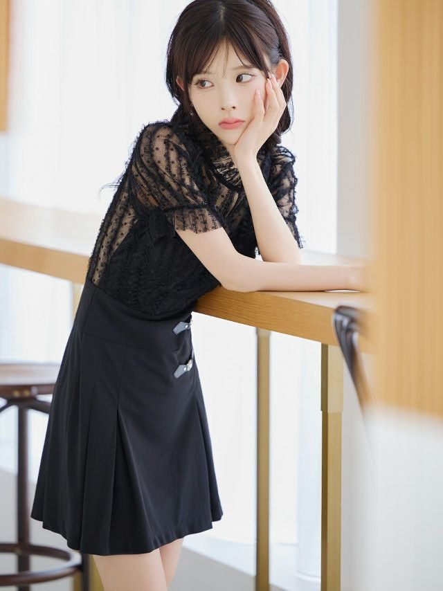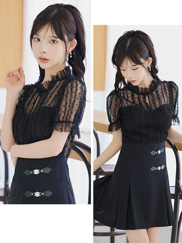 3. [韓国ドレス] モノトーンウエスト切替レースデザイン半袖フレアミニドレス (Sサイズ~Lサイズ) (緩苺/キャバドレス着用)