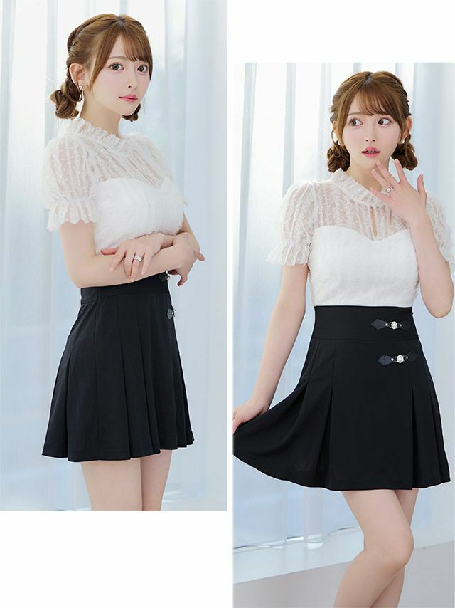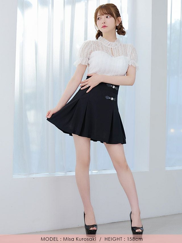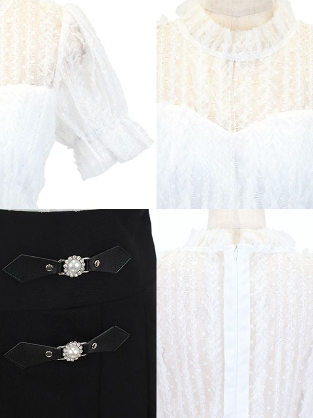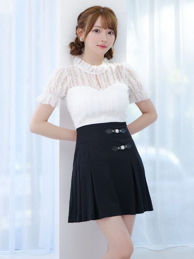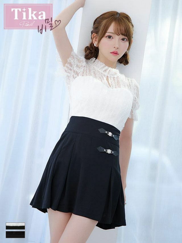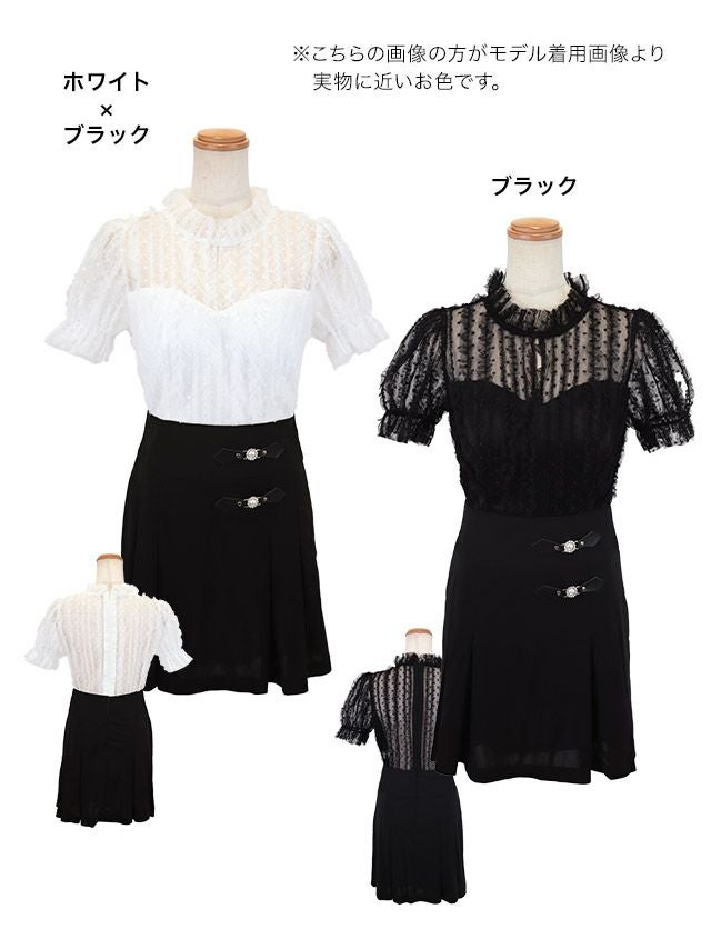 品のあるガーリーさを演出♪ [韓国ドレス] モノトーンウエスト切替レースデザイン半袖フレアミニドレス (Sサイズ~Lサイズ) (緩苺/キャバドレス着用)