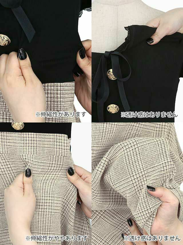4. [韓国ドレス] フリルリボンレースガーリーデザイン袖ありグレンチェック柄オフショルダーフレアミニドレス (Sサイズ~Lサイズ) (橋本萌花/キャバドレス着用)