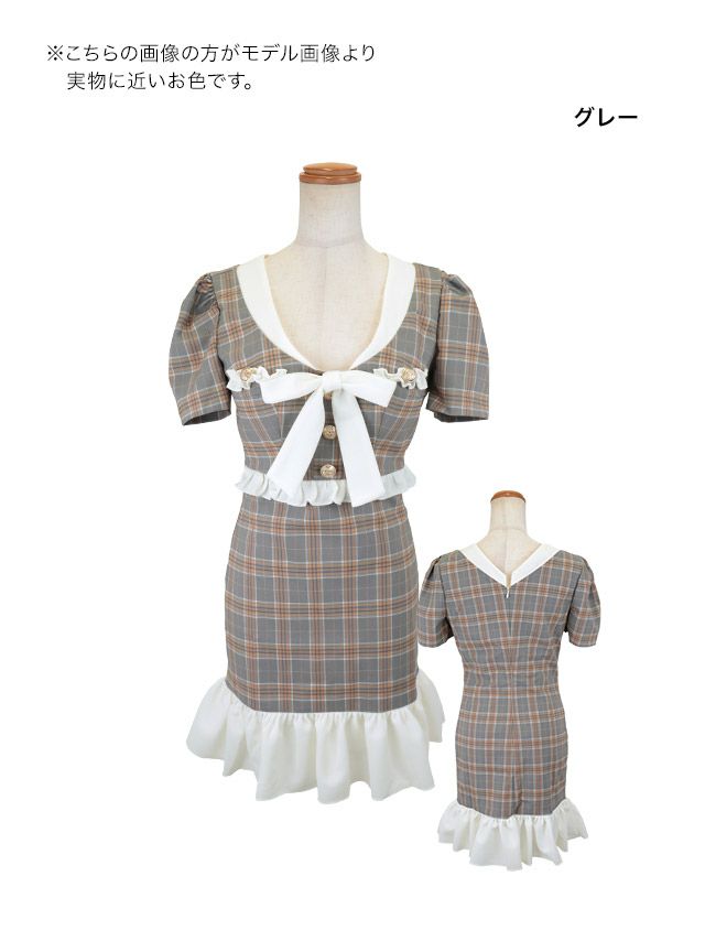 [韓国ドレス] 半袖 ネックリボン 襟付き タータンチェック柄 ゴールドボタン 裾フリル タイトミニドレス (Sサイズ~Lサイズ) (黒崎みさ/キャバドレス着用) [TikaPimil]