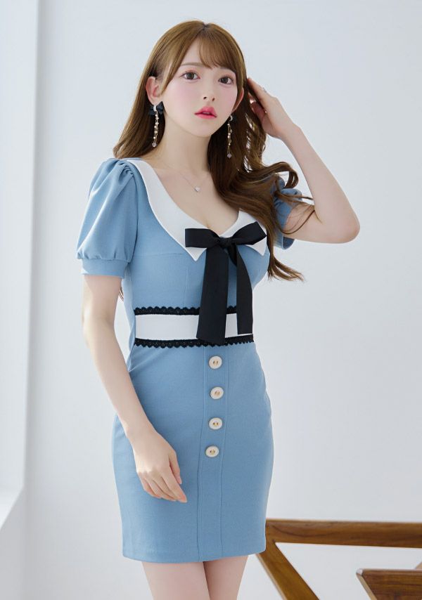 [韓国ドレス] ネックリボン 襟付き 半袖 パフスリーブ フロントボタン ストレッチ タイトミニドレス (Sサイズ~Lサイズ) (黒崎みさ/キャバドレス着用) [TikaPimil]