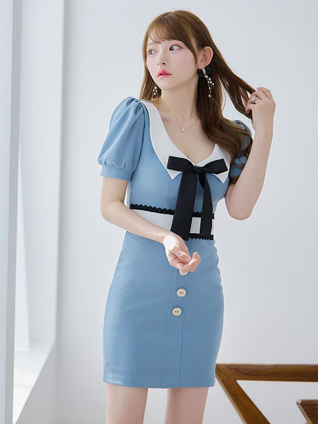 絶妙なカラーとデザインで周囲と差を付けれる♪ [SALE] [韓国ドレス] ネックリボン 襟付き 半袖 パフスリーブ フロントボタン ストレッチ タイトミニドレス (Sサイズ~Lサイズ) (黒崎みさ/キャバドレス着用) [TikaPimil]