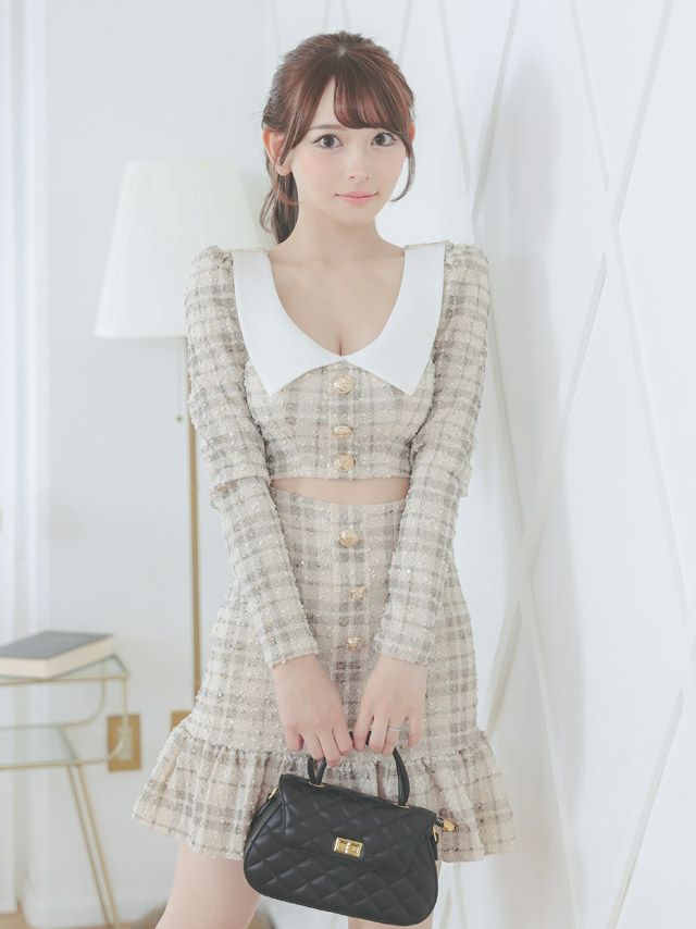 [韓国ドレス] 長袖 袖あり襟付きアウト裾フリルガーリーチェックタイトミニドレス (Sサイズ~Lサイズ) (黒崎みさ/キャバドレス着用) [TikaPimil]