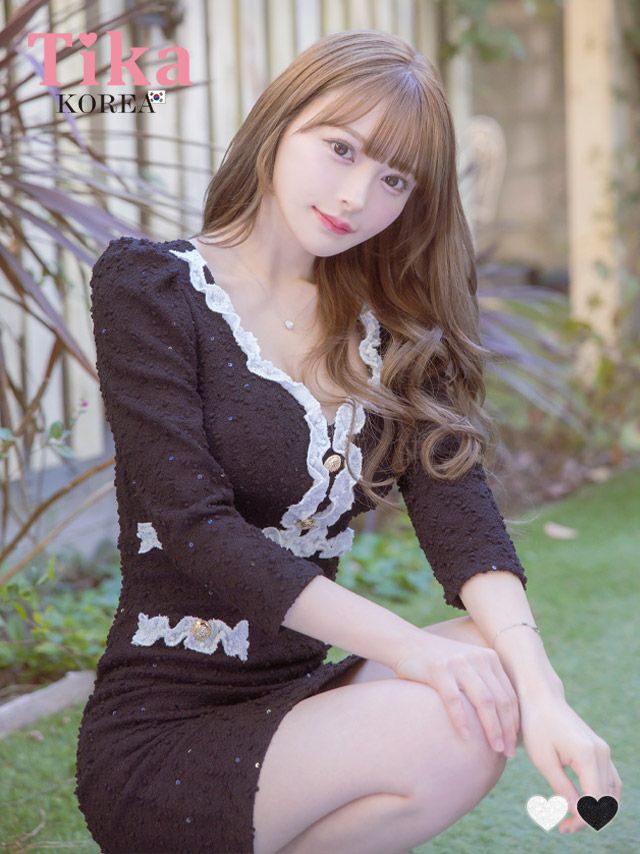 [韓国ドレス] 袖あり 八部袖 パイピング モノトーン ニット タイトミニドレス (Sサイズ~Lサイズ) (重川茉弥/キャバドレス着用) [TikaPimil]