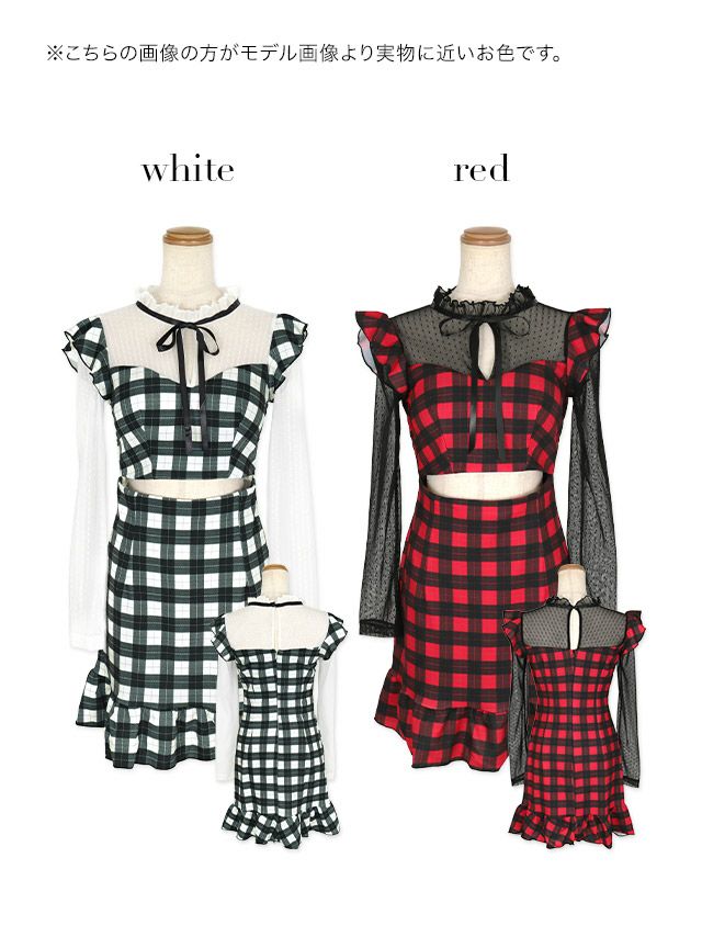 長袖シアーネックリボン切り替えガーリーチェック柄ウエストカットアウト裾フリルタイトミニドレスのカラーバリエーション