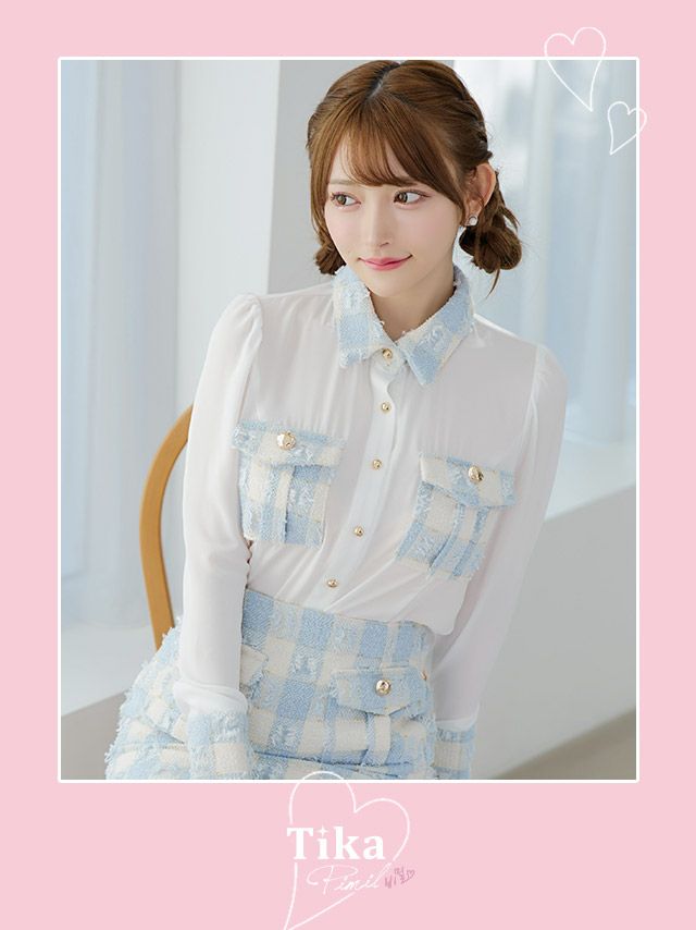5. [韓国ドレス] 襟付き 長袖 袖あり シアーブラウス ツイード調 ブロックチェック柄 セットアップ タイトミニドレス (Sサイズ/Mサイズ) (黒崎みさ/キャバドレス着用) [TikaPimil]
