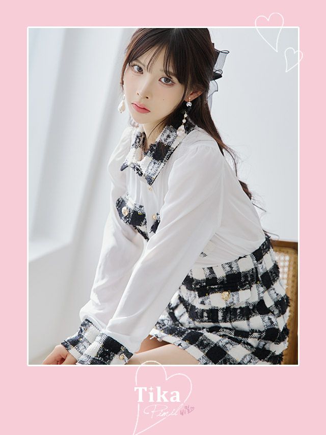 3. [韓国ドレス] 襟付き 長袖 袖あり シアーブラウス ツイード調 ブロックチェック柄 セットアップ タイトミニドレス (Sサイズ/Mサイズ) (黒崎みさ/キャバドレス着用) [TikaPimil]