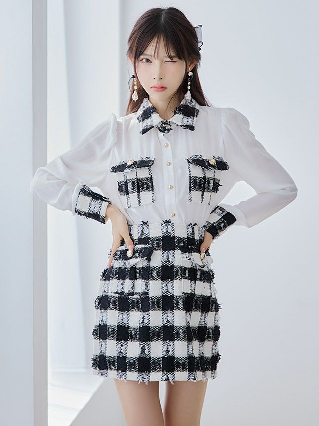 4. [韓国ドレス] 襟付き 長袖 袖あり シアーブラウス ツイード調 ブロックチェック柄 セットアップ タイトミニドレス (Sサイズ/Mサイズ) (黒崎みさ/キャバドレス着用) [TikaPimil]