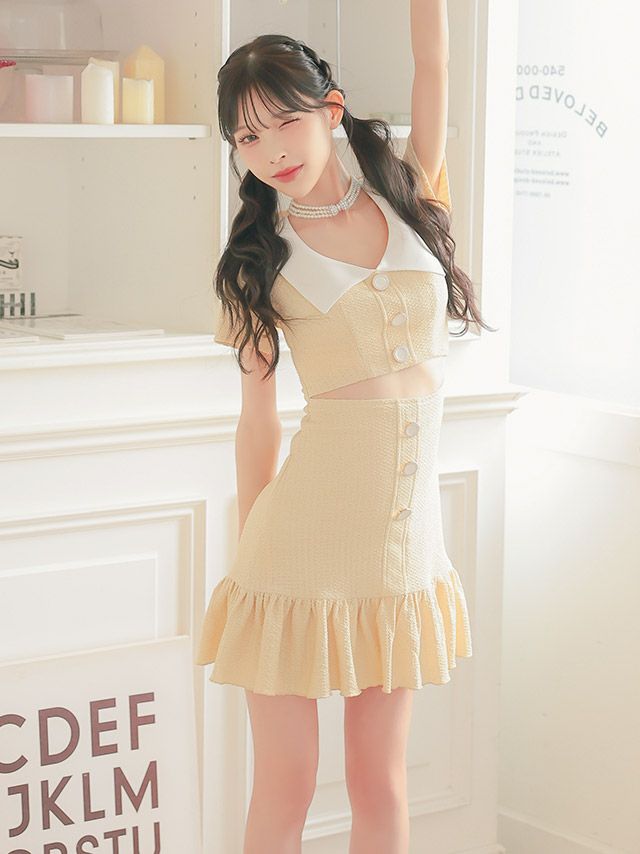 3. [韓国ドレス] ミニドレス 襟付き 半袖 ボタン ウエストカット ワッフル 裾フリル タイトキャバドレス (緩苺着用) [tk-mdk5075]