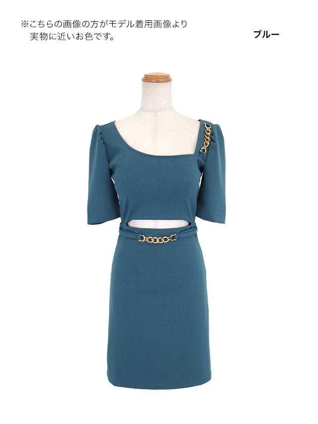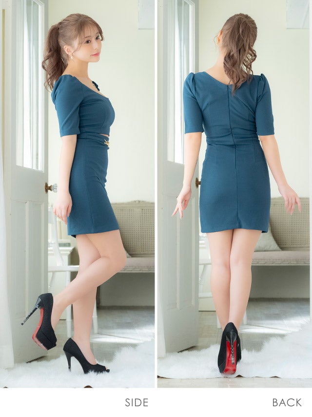 ミニドレス タイト 袖あり パフスリーブ スクエアネック ゴールドチェーン ウエストカット ストレッチ ブルー キャバドレスのカラーバリエーション