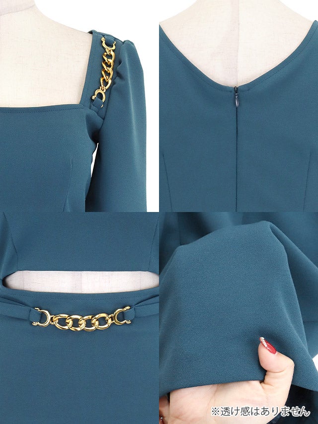 ミニドレス タイト 袖あり パフスリーブ スクエアネック ゴールドチェーン ウエストカット ストレッチ ブルー キャバドレスのディティール1 ミニドレス タイト 袖あり パフスリーブ スクエアネック ゴールドチェーン ウエストカット ストレッチ ブルー キャバドレスのディティール2
