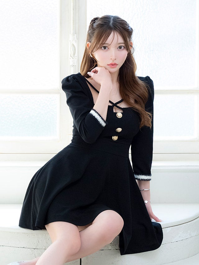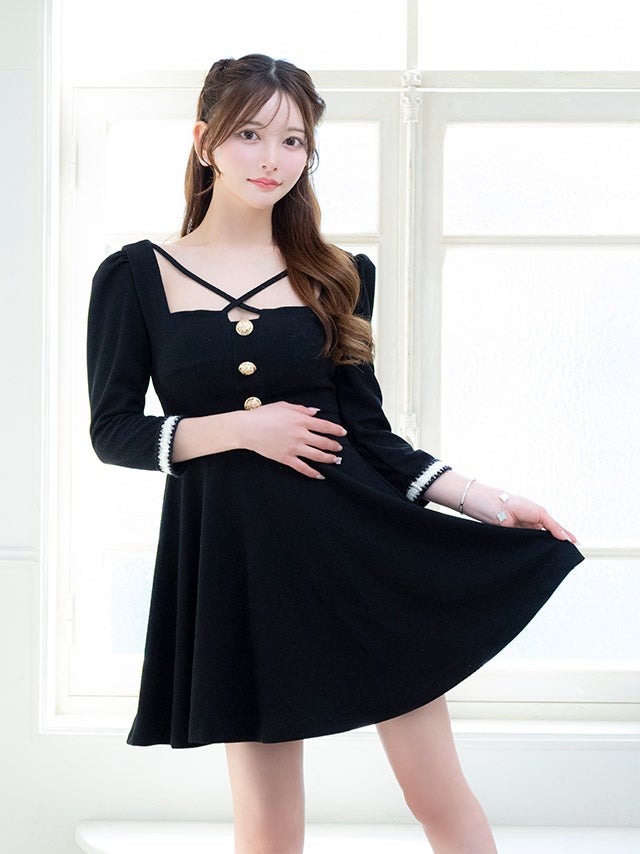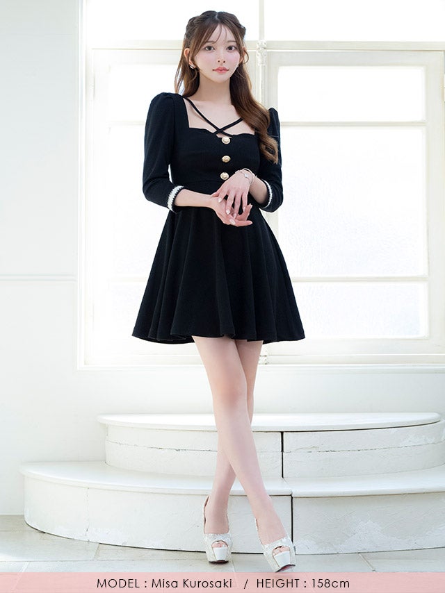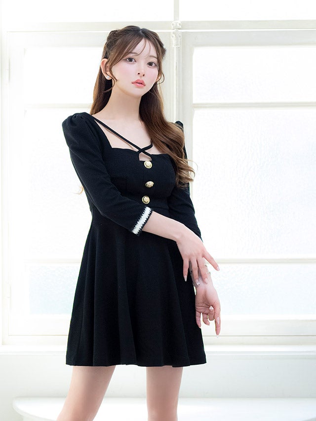 4/14新作★品格のあるお嬢様style♡ [韓国ドレス] ワンピース Aライン ミニドレス 袖あり ゴールドボタン スクエアネック クロス ストレッチ 胸元カバー 同伴 黒 ブラのまま着れる キャバドレス (黒崎みさ着用) [tk-mdk8034]